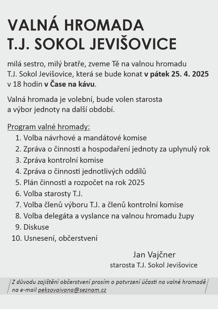 V pátek 25. dubna 2025 se v Čase na kávu v Jevišovicích uskutečnila VALNÁ HROMADA T.J. SOKOL JEVIŠOVICE. Valná hromada 2025